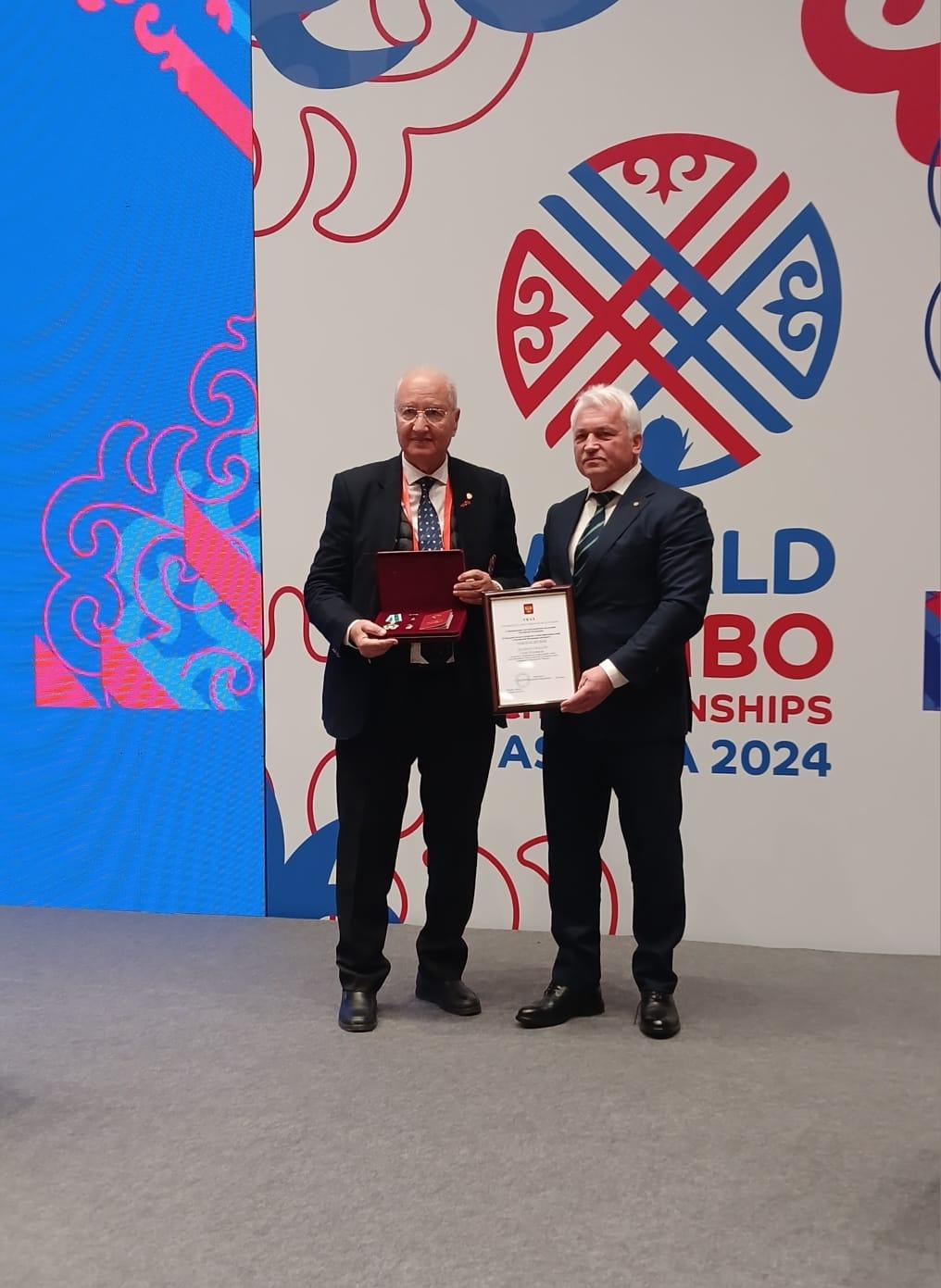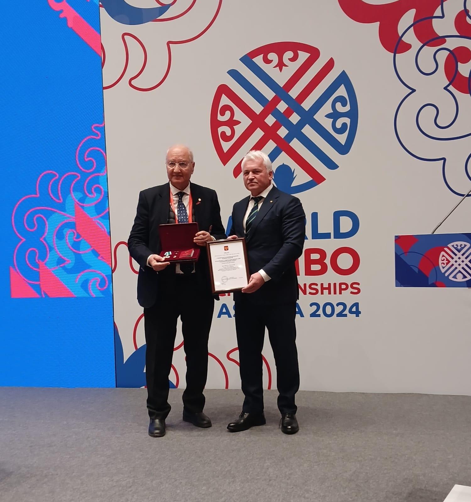 En marge du Congrès annuel de la Fédération Internationale de Sambo qui s'est tenu le Vendredi 08 Novembre 2024 à Kazakhstan, Maître Dalil SKALLI a reçu une haute décoration, décernée par l'Etat de la Fédération de Russie.