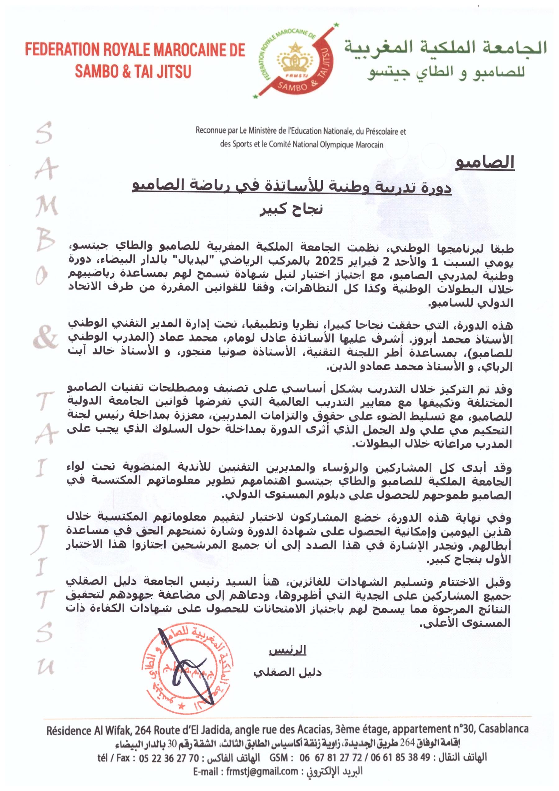 Conformément à son calendrier national, la Fédération Royale Marocaine de Sambo et Tai Jitsu a organisé les Samedi 1 er et Dimanche 2 Février 2025 au Centre Sportif « l’Idéal » à Casablanca, un Stage national des rntraîneurs de Sambo, sanctionné par un test pour l’obtention d’un certificat d’entraîneur leur permettant d’assister leurs athlètes lors des championnats nationaux, et aux diverses manifestations, et ce, conformément au règlement mis en application par la Fédération Internationale de Sambo.