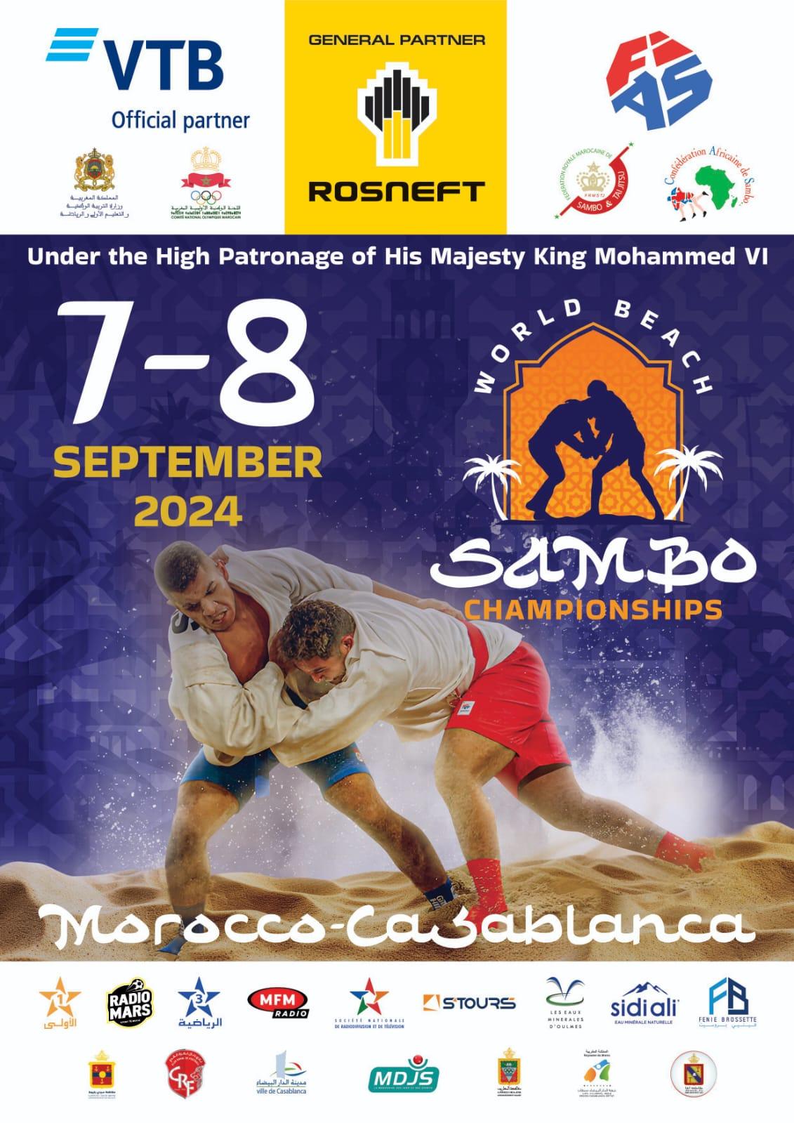 La Fédération Royale Marocaine de Sambo et Tai Jitsu organise sous le Haut Patronage de Sa Majesté le Roi Mohammed VI, que Dieu l’assiste, sous l’égide du Ministère de l’Education Nationale, du Préscolaire et des Sports, du Comité National Olympique Marocain, de la Fédération Mondiale de Sambo et de la Confédération Africaine de Sambo, la 4ème édition du Championnat du Monde de Sambo Beach à la plage Ain Diab à Casablanca, et ce, du 06 au 09 Septembre 2024.