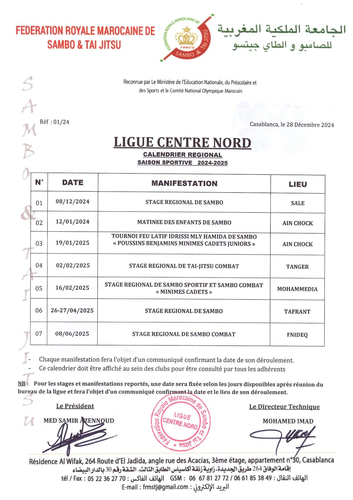 CALENDRIER RÉGIONAL - LIGUE CENTRE NORD - SAISON 2024-2025